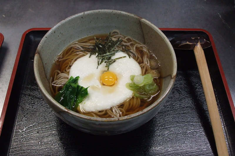冷たいとろろ蕎麦です。うずら卵を溶いて混ぜて食べて下さい。